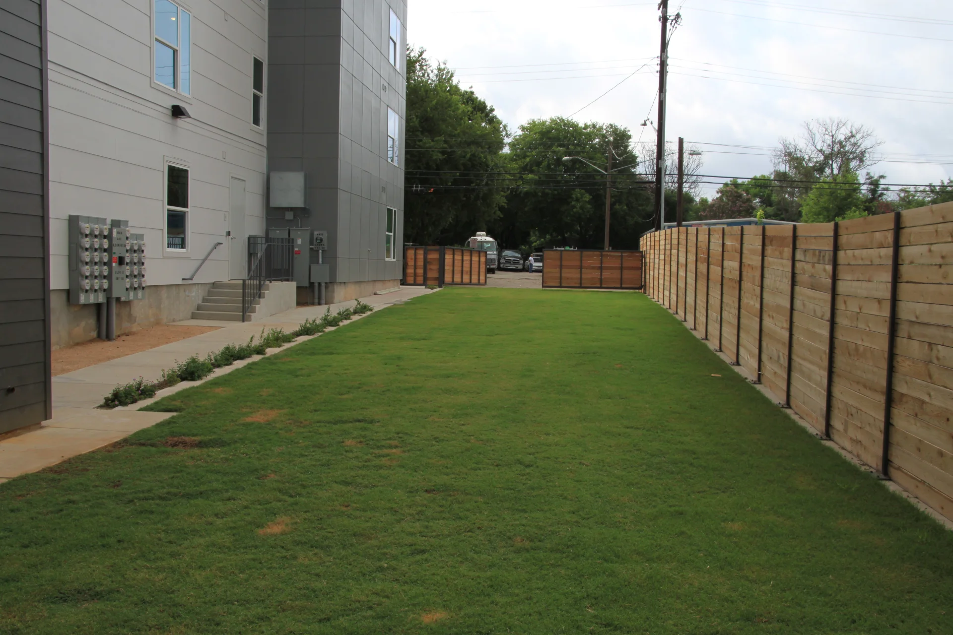 Two fire lanes were designed on the site, one on the west and the other on the east side of the property, providing crucial fire access routes. The PaveGro installation began with the west lane early in construction, with mats used for temporary construction access. The east-side fire lane was completed five months later, and both were fully grassed with 419 Bermuda in late 2020. These fire lanes, which are the only turf areas on the site, are also used for informal lawn games and pet walks, maximizing the functionality of this tight urban site.